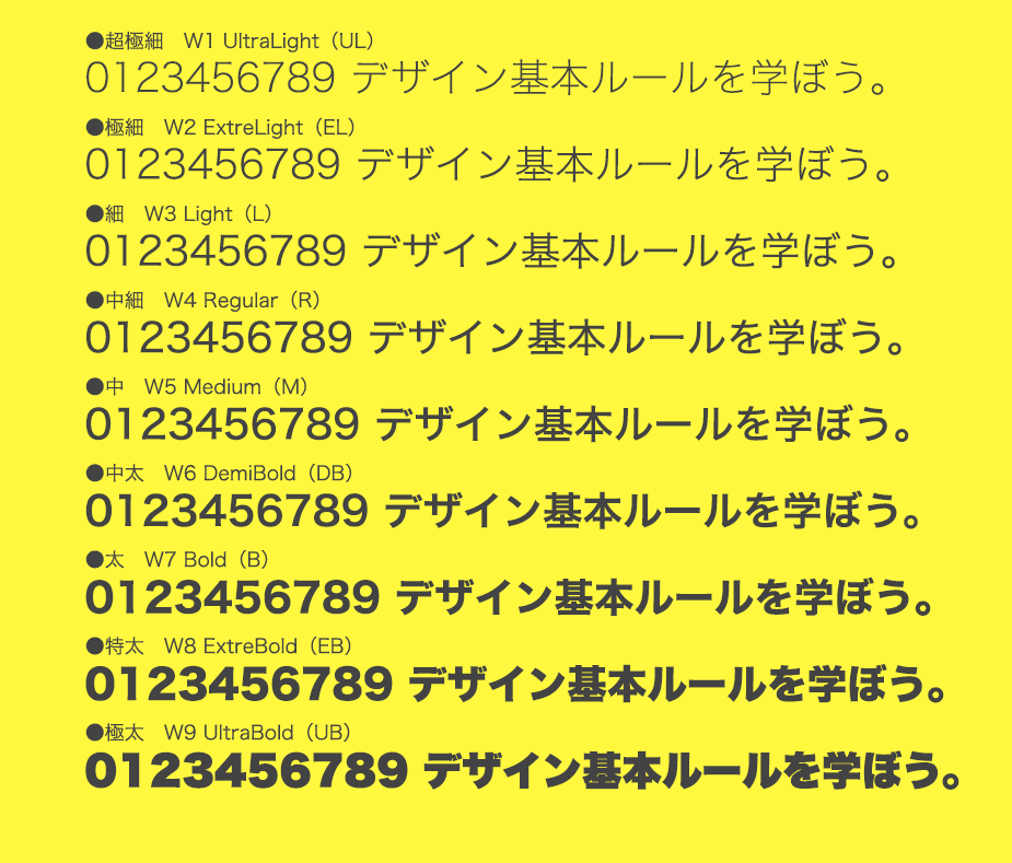 文字の太さはウェイトと言います。「フォントのウェイトが細いので、もう少し太く」など指示したりします。太さにはフォントによって細かく分かれています。