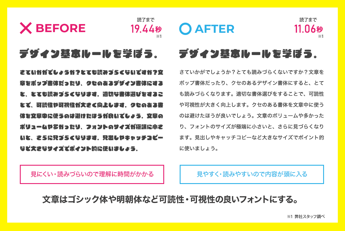 フォントの種類はもちろんのこと、大きさ、文章の長さ、行間、文字間、文字色で読みやすさは変わります。本文においては印刷物の場合は明朝体が読みやすいですが、Webの場合はゴシック体のほうが読みやすいのでしっかりと使い分けましょう。近年ではUD(ユニバーサルデザイン)フォントという可読性・視認性に特化したフォントも生まれています。