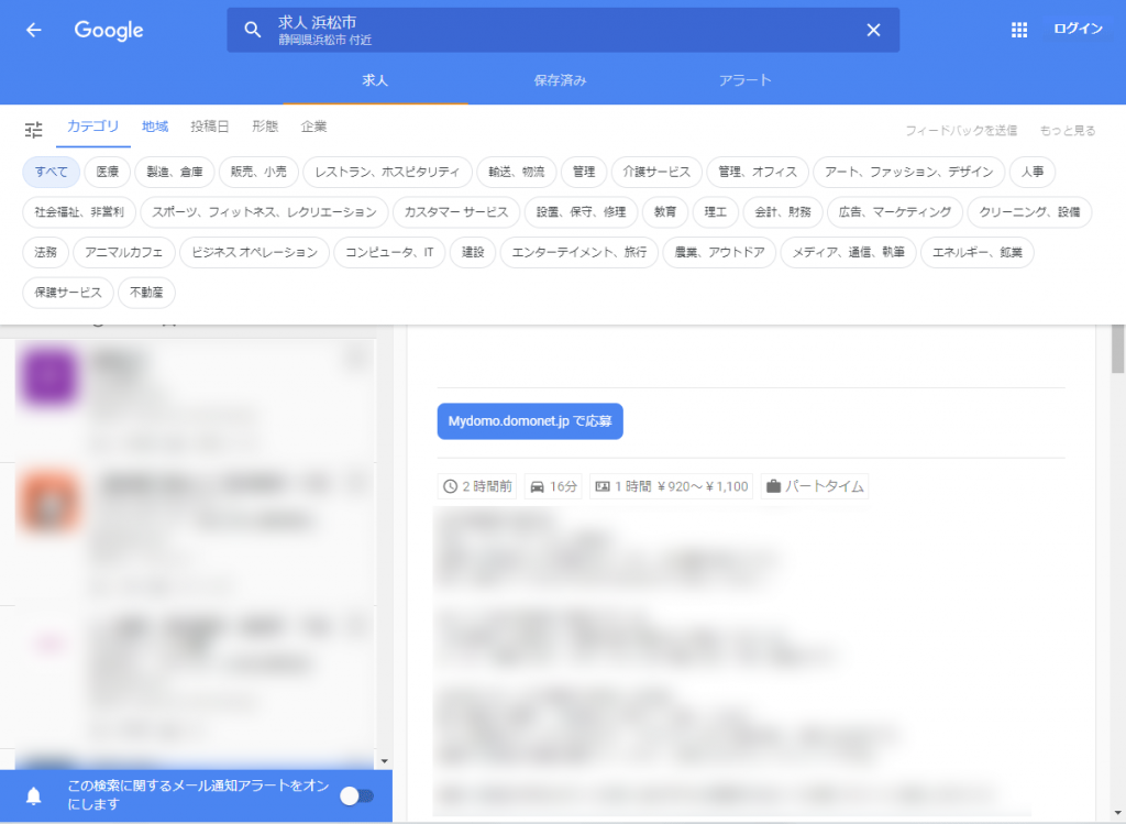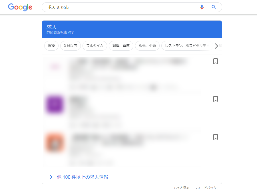 Googleで「求人 ○○」「仕事 ○○」等の求人に関するキーワードで検索した場合、求人に特化した表示形式で検索結果に表示されます。