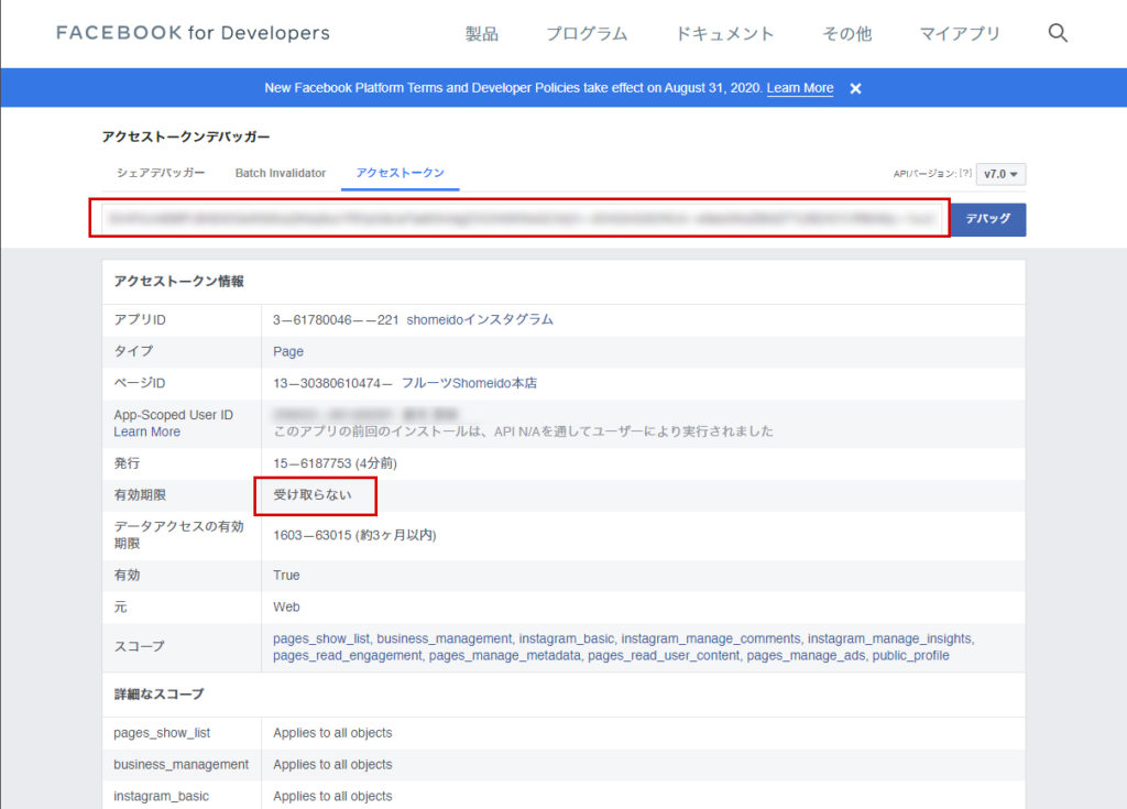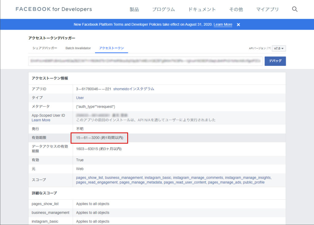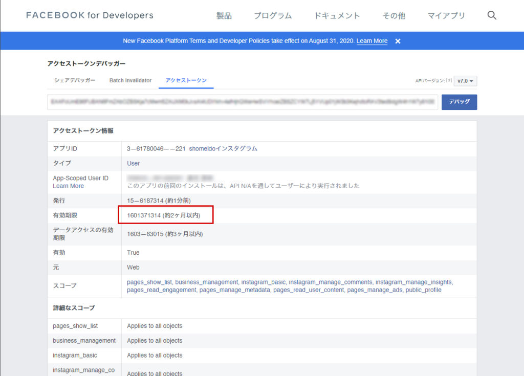 5.アクセストークンデバッガーを開き、先ほど生成されたアクセストークンをデバッグしてみましょう!