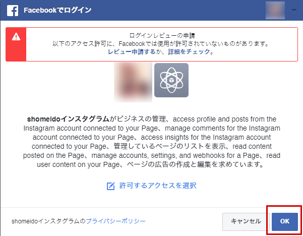 10.Facebookにログインする画面が表示されたら、OKを押す。
