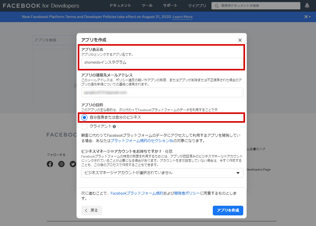 4.アプリ表示名とアプリを利用できる人を自分、同じビジネスに所属する人に設定 → アプリIDを作成