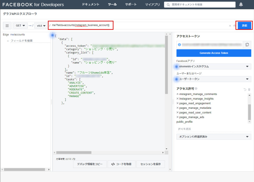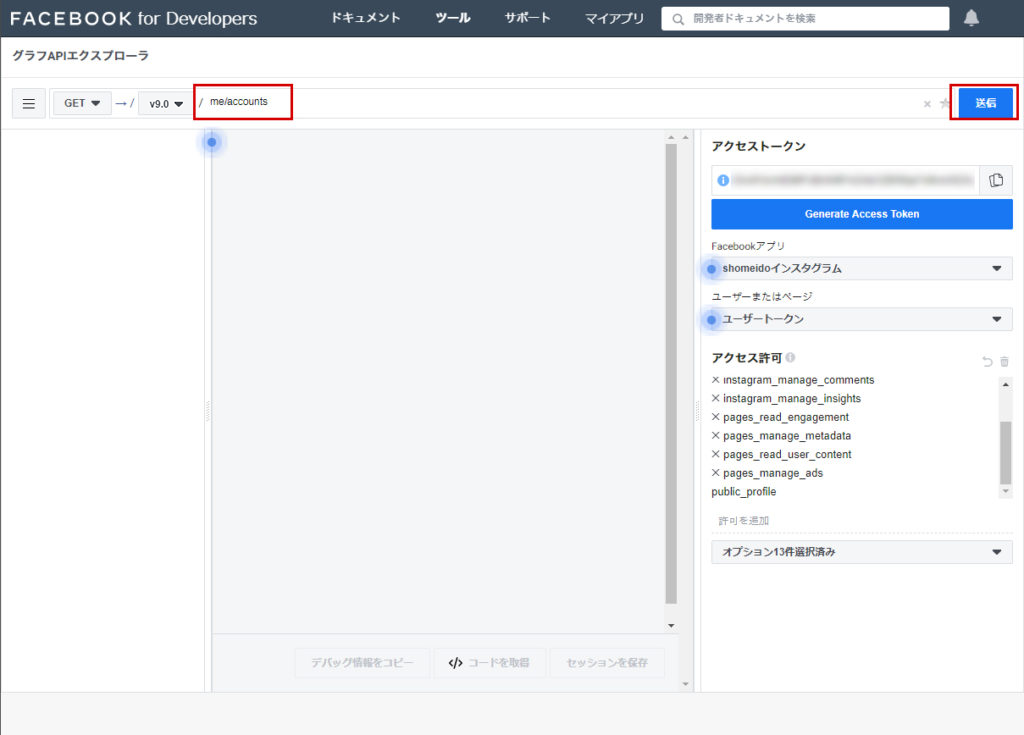 me?fields=accounts{instagram_business_account}と入力して送信をクリック