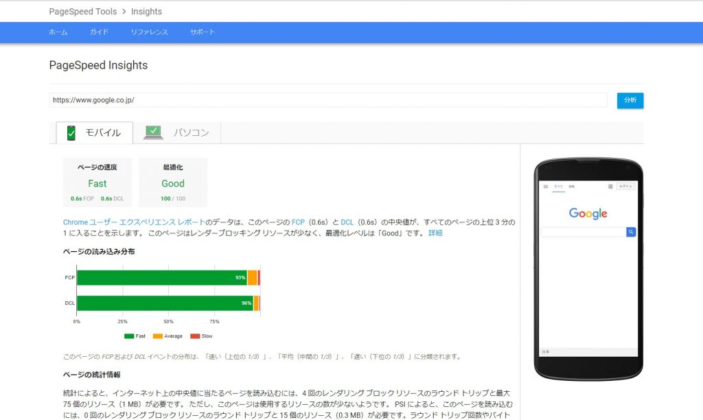 今回Googleのサイトを計測した結果、モバイル・パソコンとも「Good」100点でした。