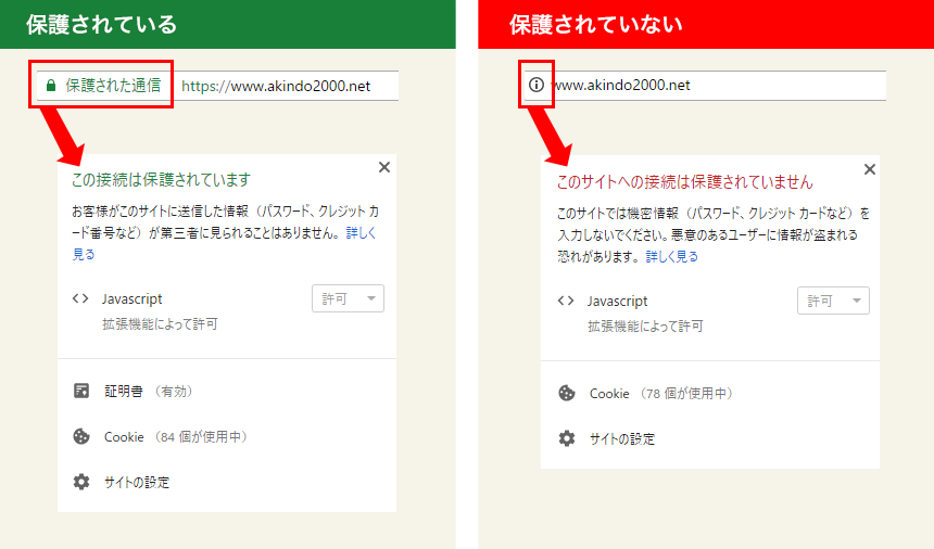 https未対応だと「保護されていません」と警告が文字で表示されるようになります。