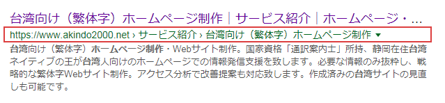 この様に検索結果のページタイトルにパンくずリストが付いて表示されました。
