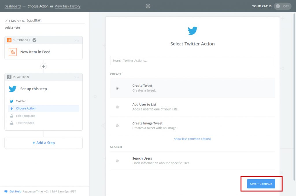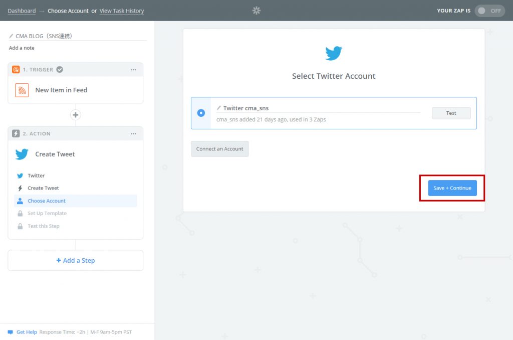 連携したいTwitterアカウントを読み込み、「Save+Continue」で次へ進みます。