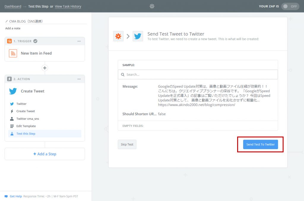 表示方法を確認し、「Send Test To Twitter」をクリック。