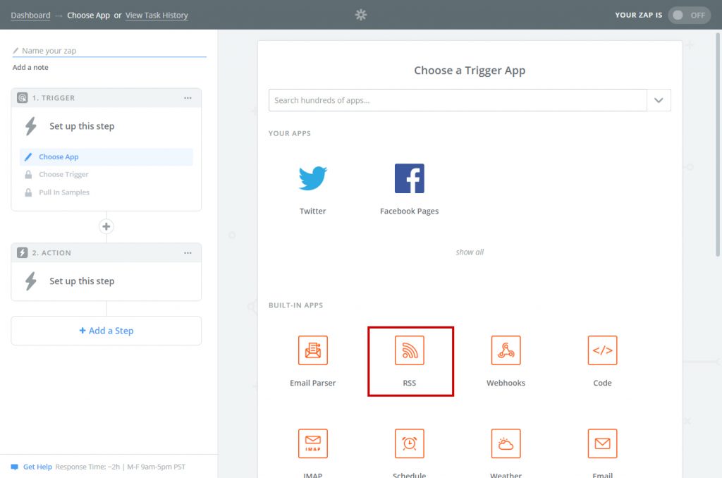 「TRIGGER」設定するため、BUILT-IN APPSの「RSS」をクリック。