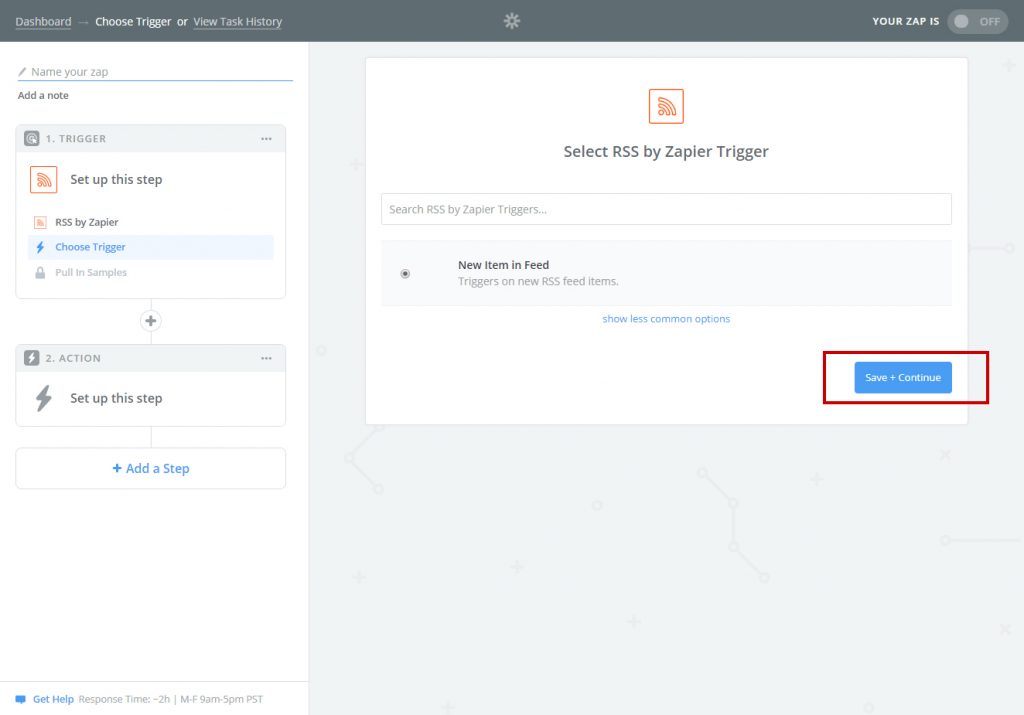 「New Item in Feed」にチェックし、「Save+Continue」で次へ進みます。