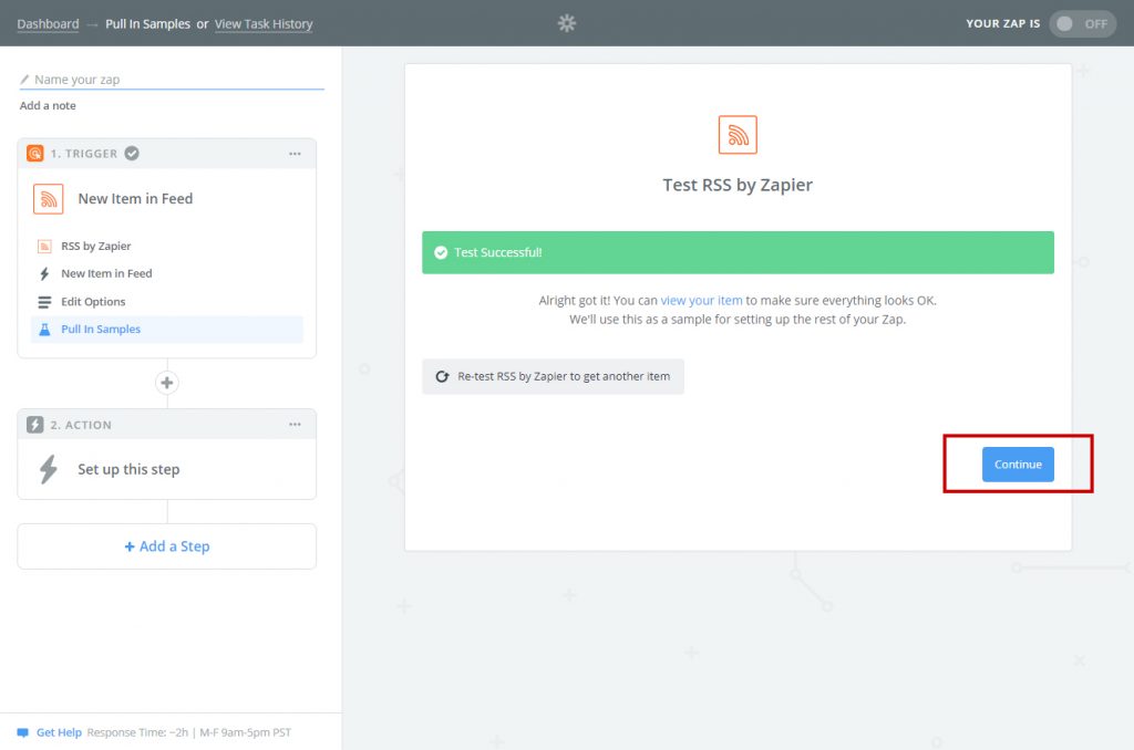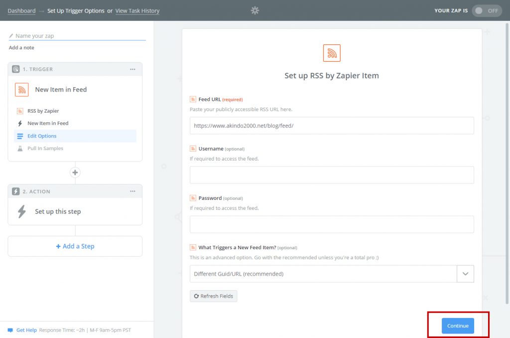 Feed URLに連携したいURLを入力し、「Continue」をクリック。