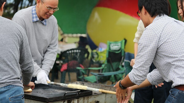 今年は、浜松市西区の弁天島にある渚園で開催しました。バーベキューやチーム対抗料理、巨大ビーチバレーボールを企画しました。