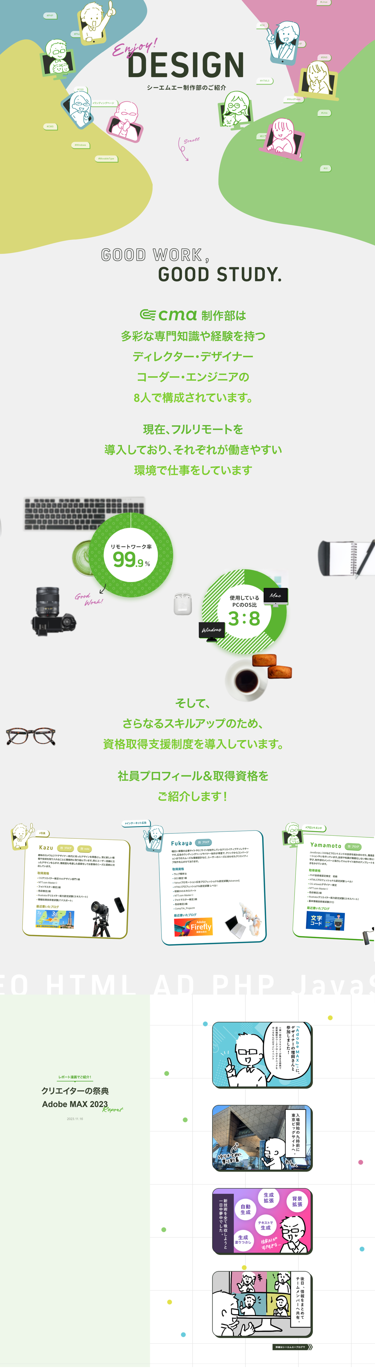 シーエムエー制作部のデザイナー・エンジニアの働く環境、プロフィール、取得資格などご紹介いたします。