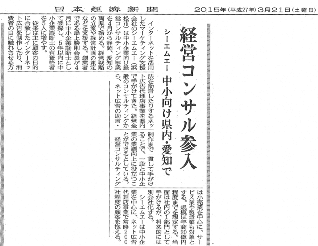 2015年3月21日(土)付の日本経済新聞朝刊で、シーエムエーが紹介されました。