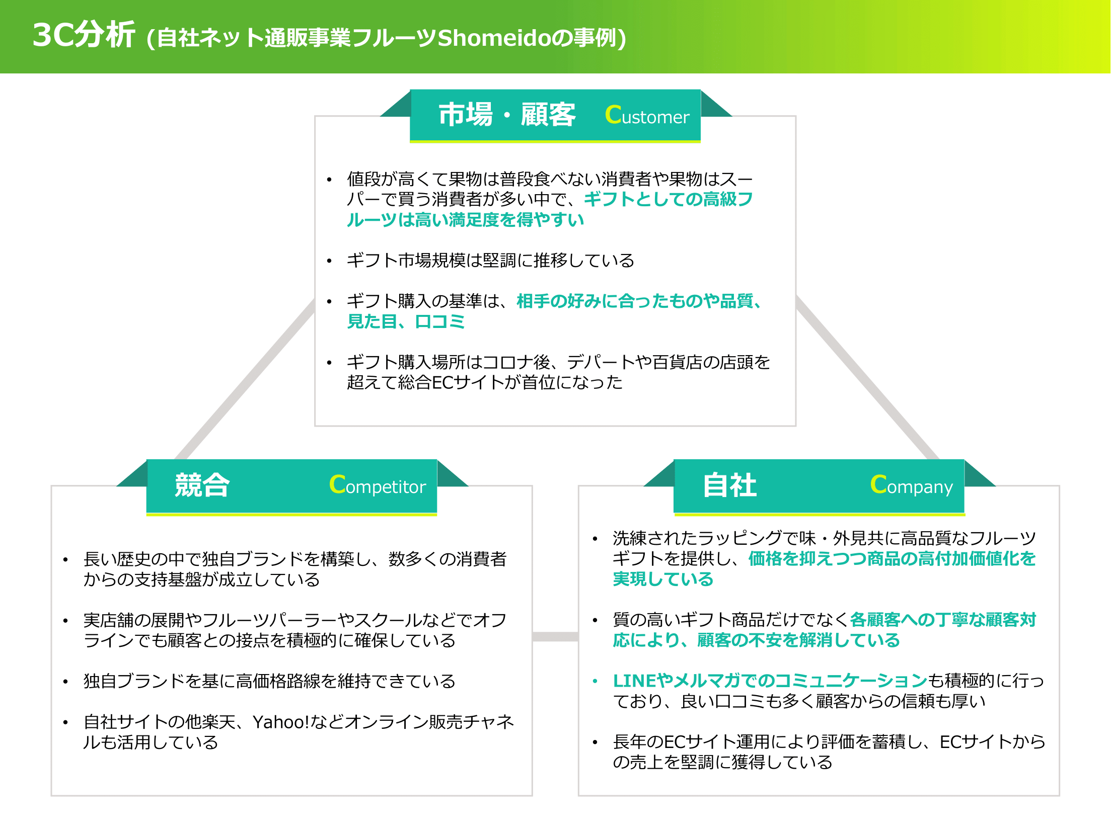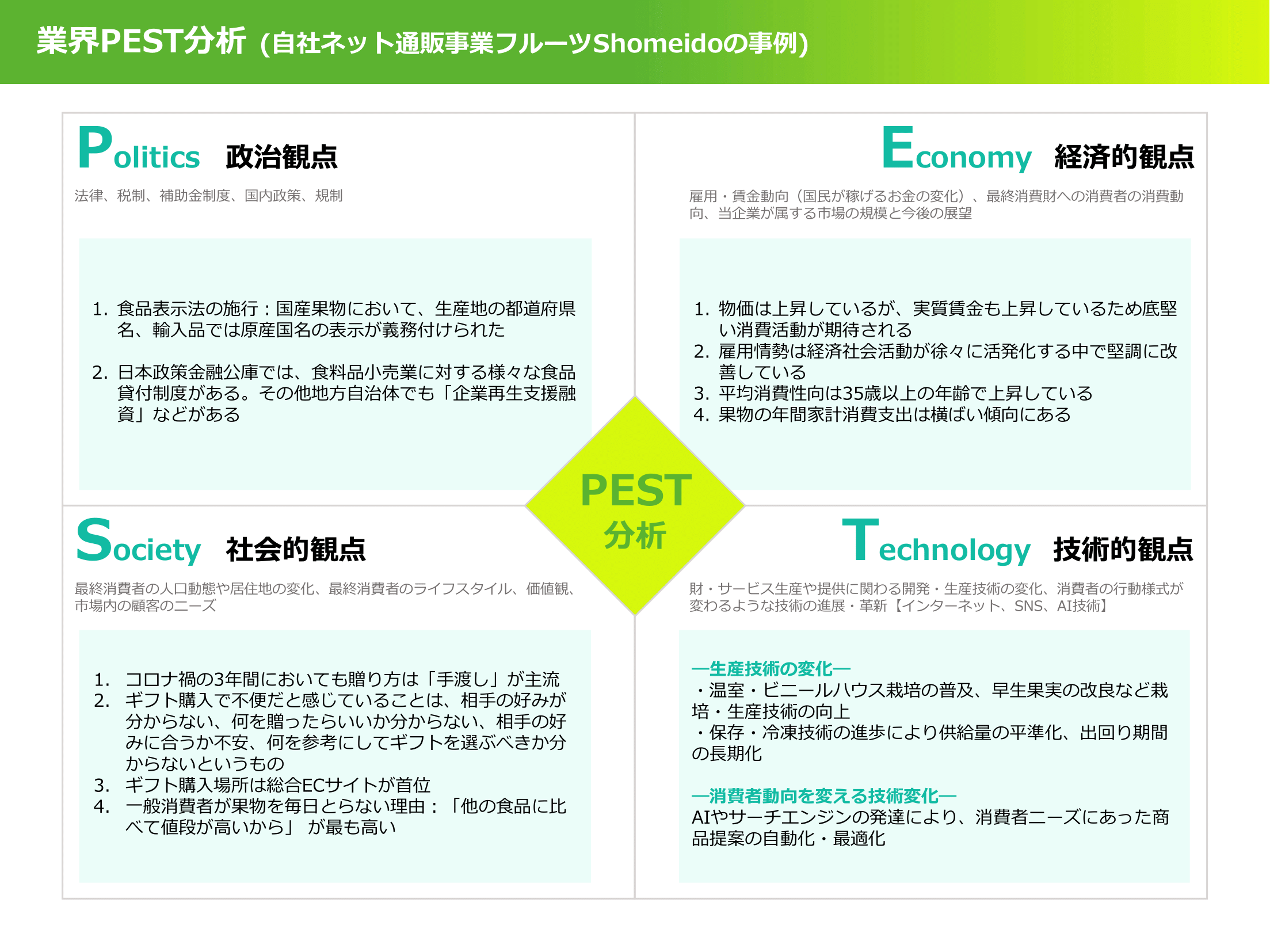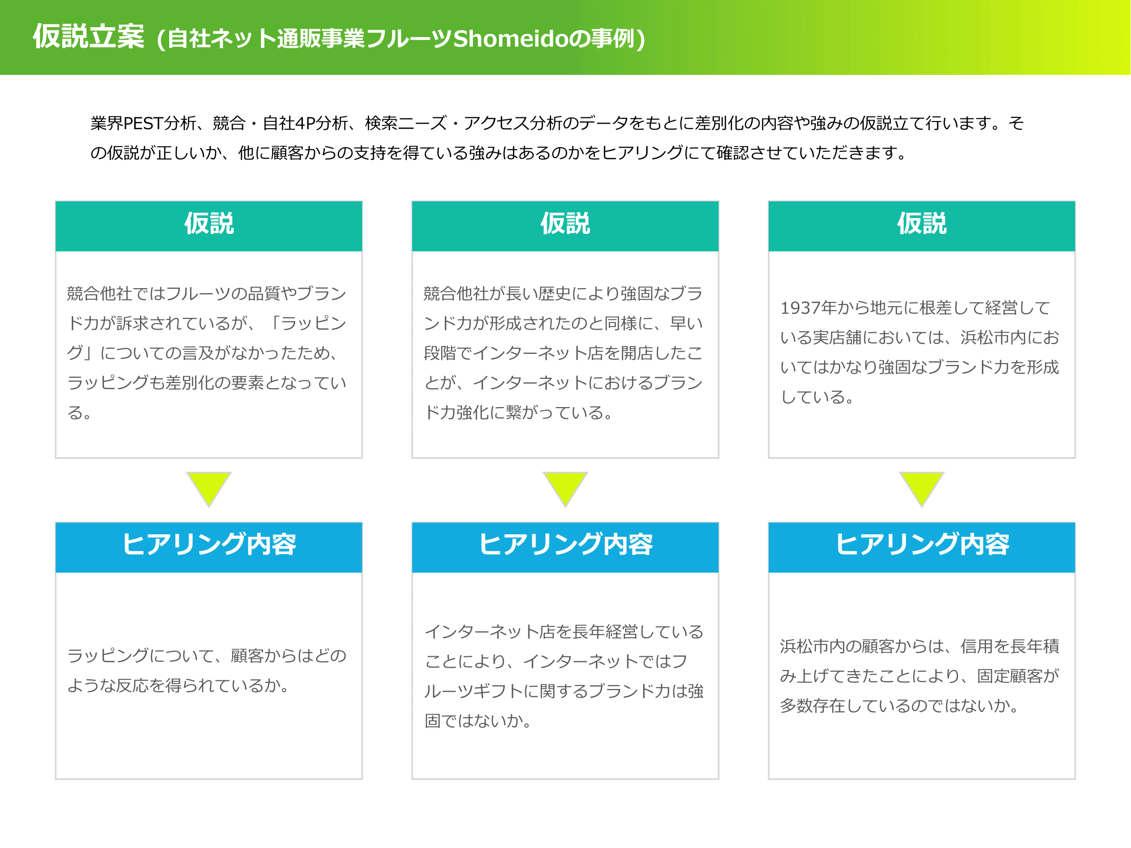 貴社の理解を深めるため、専門のコンサルタントが一連の調査・分析を実施します。ここで、戦略策定や施策立案につながる情報を整理します。